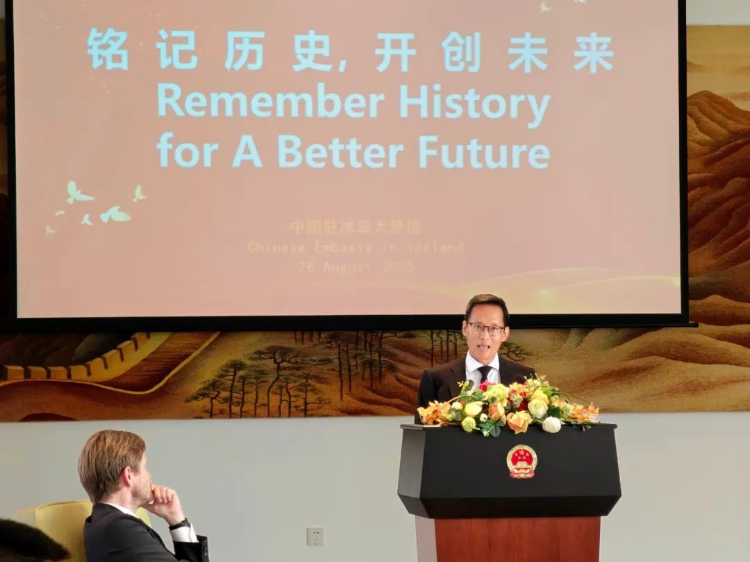 人民网斯德哥尔摩8月29日电(记者殷淼)当地时间8月28日,中国驻冰岛使馆举办“铭记历史、开创未来”座谈会、《里斯本丸沉没》在冰首映式及酒会。中国驻冰岛大使何儒龙和国际儒学联合会副理事长鲍德松出席并致辞,冰外交部、冰中文协、冰中贸协、华侨华人及留学生等近百人出席。