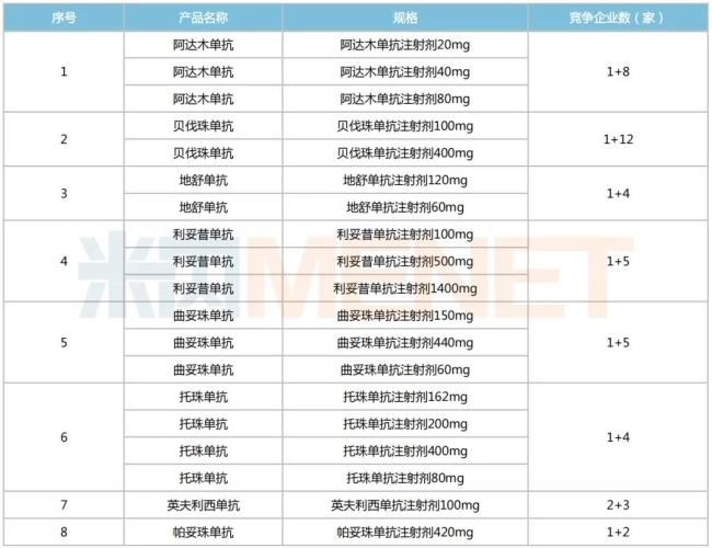 此次被纳入集采的8个生物药包括:阿达木单抗、贝伐珠单抗、地舒单抗、利妥昔单抗、曲妥珠单抗、托珠单抗、英夫利西单抗、帕妥珠单抗。