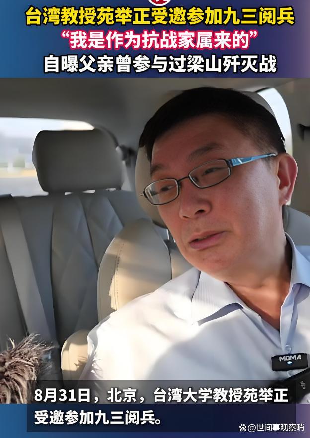 苑举正是作为抗战家属来的。他的父亲曾在1939年8月初参加山东省鲁西南汶上县及宁阳县联合组成的游击部队。当时他是汶上县代理县长,带领八路军115师对日军展开奇袭,最终取得了“梁山歼灭战”的胜利,击毙日寇300余人。在台湾,苑举正的父亲一度不太敢讲这段历史,但后来还是写了出来。现在苑举正与家人一起收集资料,希望完整记录这段历史。