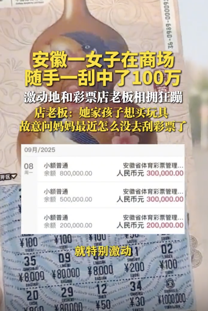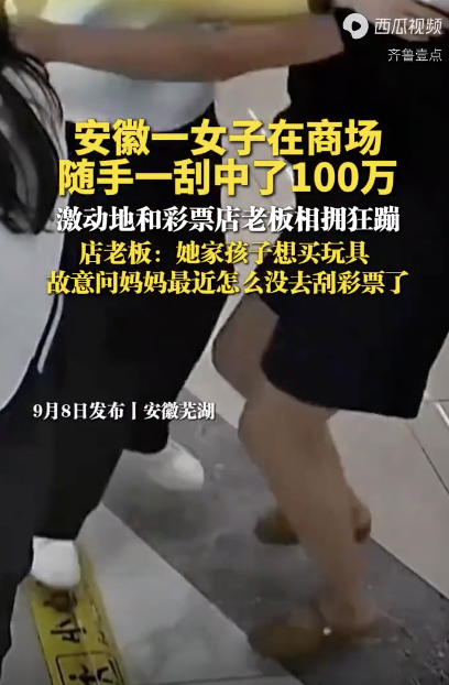 彩票店老板回应女子随手一刮中100万。9月8日发布,安徽芜湖。一女子在商场随手一刮中了100万,激动地和彩票店老板相拥狂蹦,店老板:她家孩子想买玩具,故意问妈妈最近怎么没去刮彩票了。