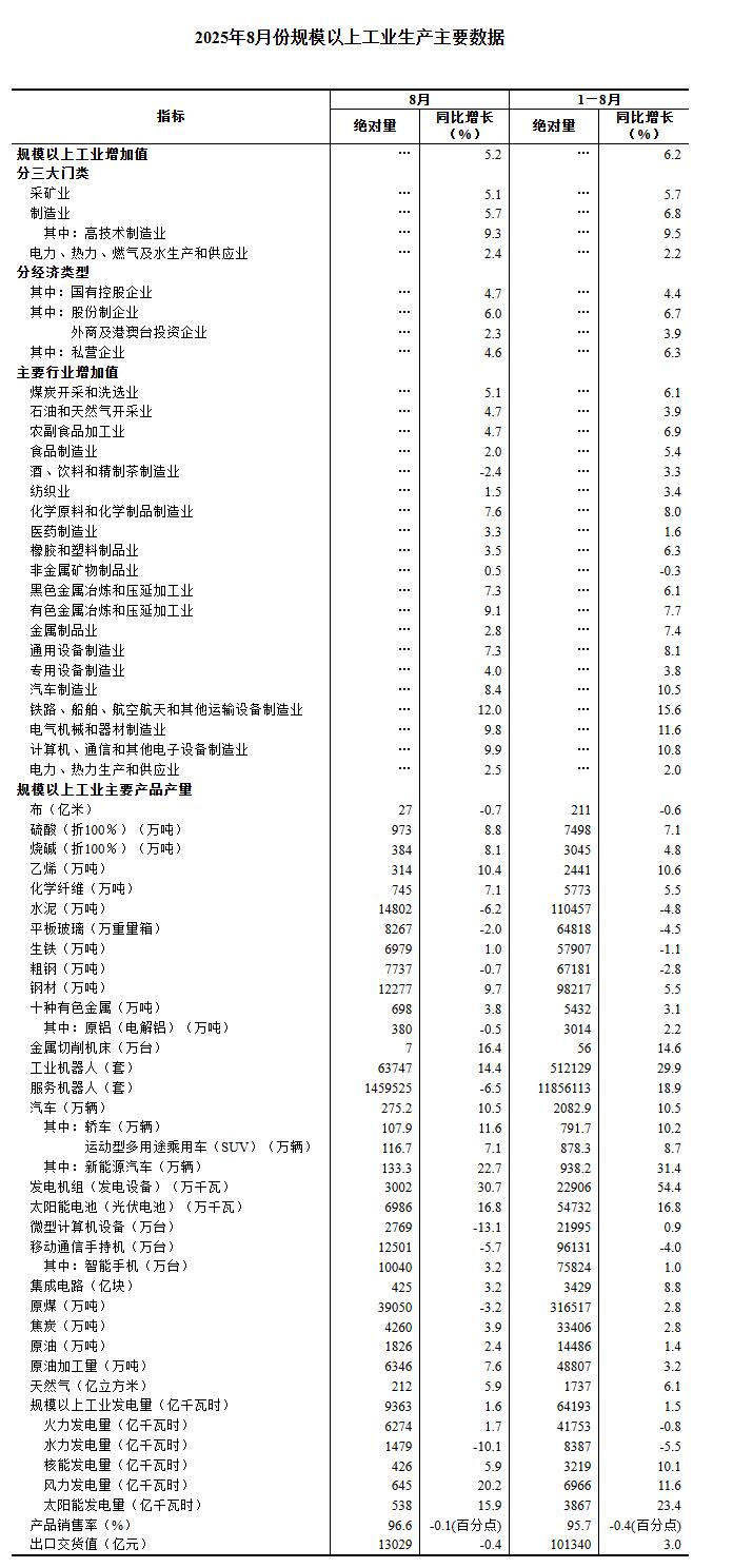 分三大门类看,8月份,采矿业增加值同比增长5.1%,制造业增长5.7%,电力、热力、燃气及水生产和供应业增长2.4%。