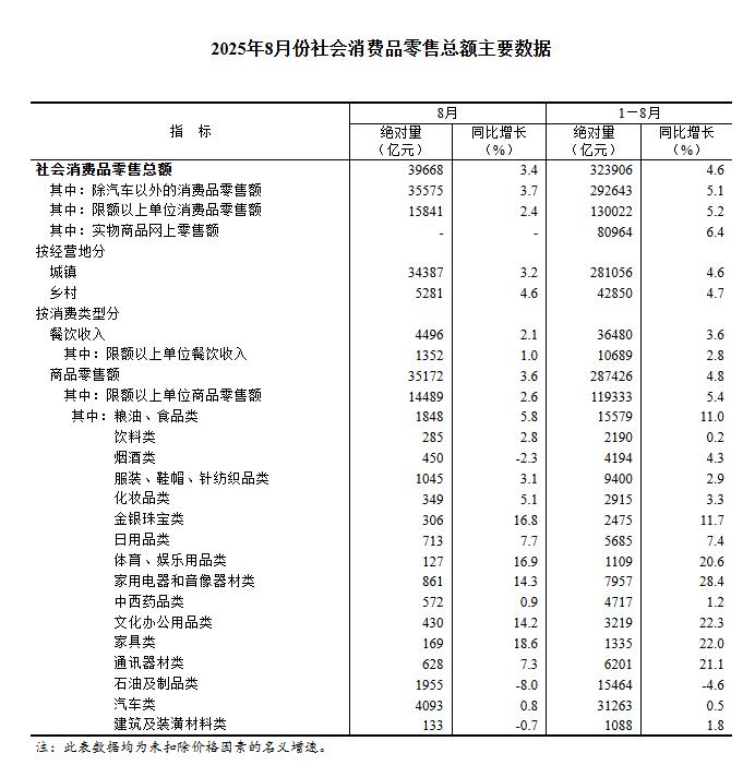 中新网9月15日电 据国家统计局网站消息,8月份,社会消费品零售总额39668亿元,同比增长3.4%。其中,除汽车以外的消费品零售额35575亿元,增长3.7%。1—8月份,社会消费品零售总额323906亿元,增长4.6%。其中,除汽车以外的消费品零售额292643亿元,增长5.1%。