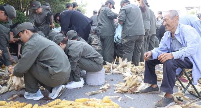 该校很多学生在社交平台分享了当天徒步拉练的过程,还有学生分享了自己帮老农拉玉米、剥玉米的视频。一名参与剥玉米的同学介绍,他们在学校附近一条马路上拉练,看到一对老年夫妇正在把地里的玉米往三轮车上装,教官和学生们立即下田,帮他们把玉米装上车,并转运到马路边。