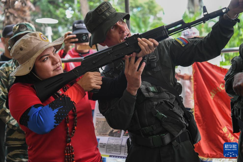 9月20日,在委内瑞拉首都加拉加斯,武装部队人员指导一名参训者使用枪支。新华社发(马科斯·萨尔加多摄)
