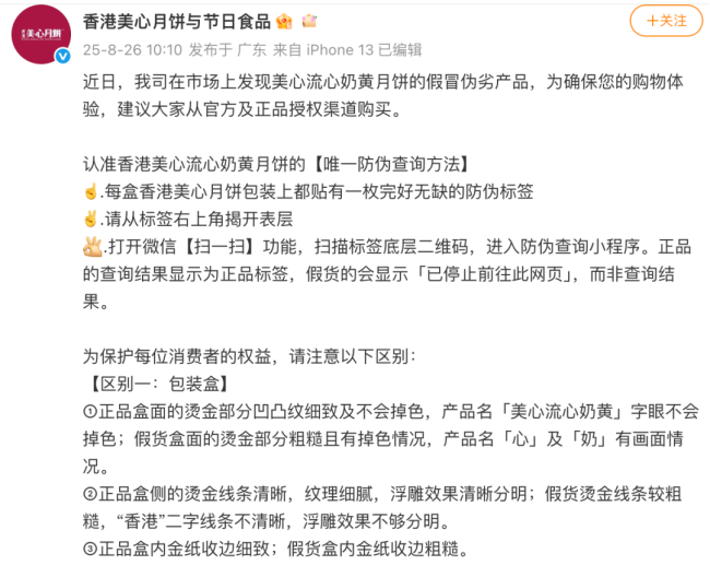 早在今年8月26日,香港美心月饼官方微博就已发布声明,提醒消费者警惕市场上出现的假冒伪劣产品,呼吁通过正规渠道购买,以免上当受骗。