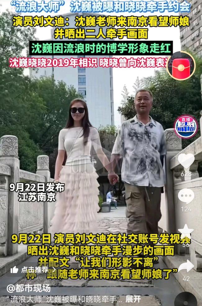 流浪大师沈巍和晓晓牵手约会。9月22日,有消息称“流浪大师”沈巍和晓晓在南京牵手约会,这一消息得到了沈巍的大弟子刘文迪的证实,并随同前往。许多网友称赞他们是“灵魂伴侣”。