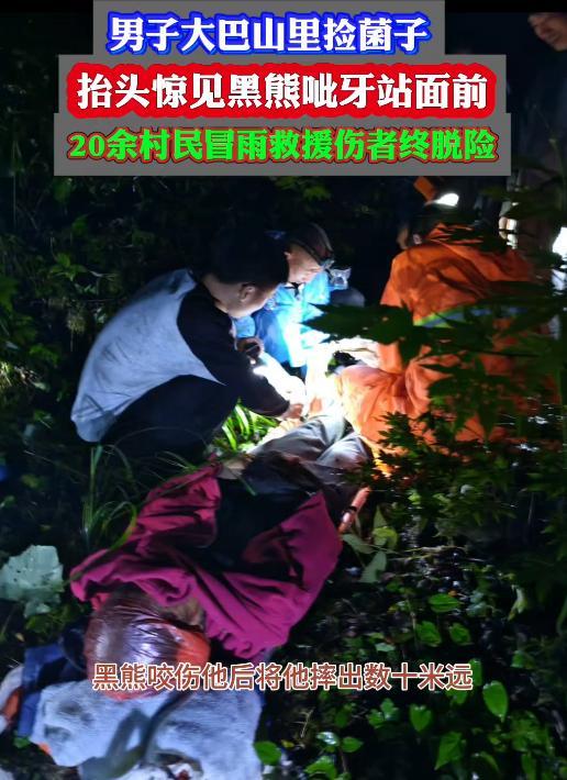 当天上午8时左右,李先生和妻子背着背篼拿着弯刀出门到山里捡拾菌子。雨中他们在大山里转来转去,不知不觉来到数公里外的密林深处。李先生走得快,妻子落在后面一段距离。下午2时左右,李先生大约捡到了5斤菌子,这时惊魂一幕发生了。他在一个山坡上正弯腰捡拾菌子,抬头猛然发现一只约200多斤重的黑熊站在眼前。黑熊张嘴呲牙瞪着他,随后迅速对他展开袭击,咬住他左脚穿着的水鞋并把他摔下坡坎。幸好坡坎下有棵树挡着,李先生昏了过去。不知过了多久,他听到妻子在喊他,醒来后发现左脚那只水鞋不在了,脚上有被黑熊咬伤的痕迹。担心再次遭熊袭击,他强忍疼痛在妻子搀扶下来到一处低洼地带躲避。