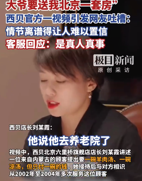 这则视频是网友“考古”挖出来的,事件已经过去20多年了。视频中,西贝北京六里桥旗舰店店长刘某霞讲述,有一次一位来自内蒙古的顾客提出要一碗羊肉汤、一碗凉汤,但只付一碗的钱,她接待后与对方相识,从2002年至2004年多次服务这位顾客。后来这位顾客说自己要去养老院,想把自己在北京的一套一室一厅的房子给她。“我那时候17岁啊,给我吓的。”刘某霞在视频中讲述,她拒绝了大爷的好意,后来也没再联系。