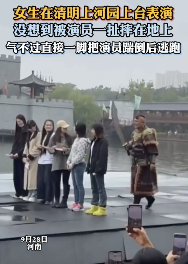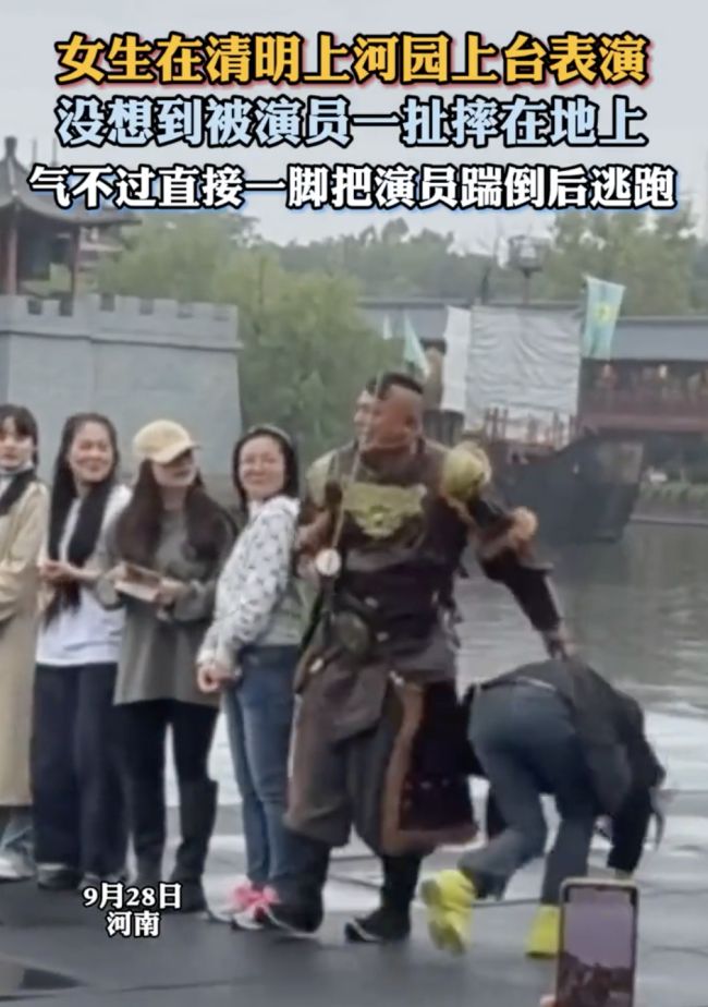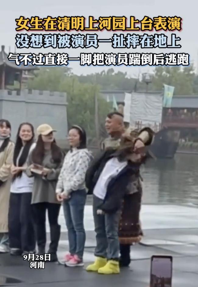 女生上台表演被演员扯摔在地上。女生在清明上河园上台表演,没想到被演员一扯摔在地上,女生气不过起身将演员踹了一脚,撒腿就跑,现场观众大笑!女生上台表演被演员扯摔在地上女生上台表演被演员扯摔在地上女生上台表演被演员扯摔在地上