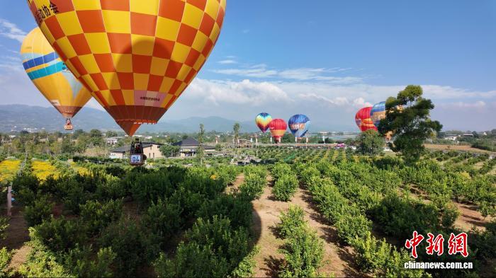 中新网成都10月15日电 (王利文 邹立杨)2025年全国热气球精英赛(四川金堂站)暨成都市低空文旅消费季活动15日在成都金堂启幕。在主会场天府橘乡旅游景区,30支参赛队伍依次完成点火、充气,色彩斑斓的热气球依次腾空,与成熟待收的万亩橘林、错落川西民居构成美好画卷,拉开了一场融合体育竞技、低空经济与文旅消费的盛会序幕。