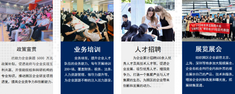 园区通过集中培训、集中交流等形式开展,开展创业辅导和帮扶,补齐短板,提高企业存活率和竞争力。服务范围涵盖:如政策宣贯、政务代办、人才招聘、人员培训、组织参展、安全生产指导、融资对接等。