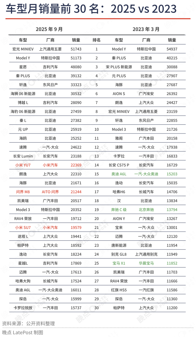 值得一提的是,在2023年3月榜单中的第三名产品,累计销量超160万辆的SUV销冠,在2025年的10月被一句“海狮06是宋PLUS的换代车型”所终结。这款曾单月卖出5.6万辆、占据海洋网三分之一销量的“神车”,完成了它的历史使命,也或多或少预示着,中国新能源市场正朝向新阶段迈出坚实的步伐。另外曾经长期盘踞在中国豪华车市场的BBA组合,也就是奔驰、宝马和奥迪,在2023年还各自有一款产品上榜,但在2025年也只剩下奥迪A6L一款神车。
