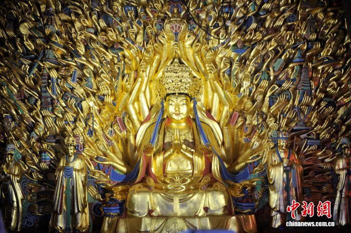 2015年6月13日,世界文化遗产大足石刻千手观音“闭关”8年修复完成,千手观音金身再现正式对外开放。陈超 摄