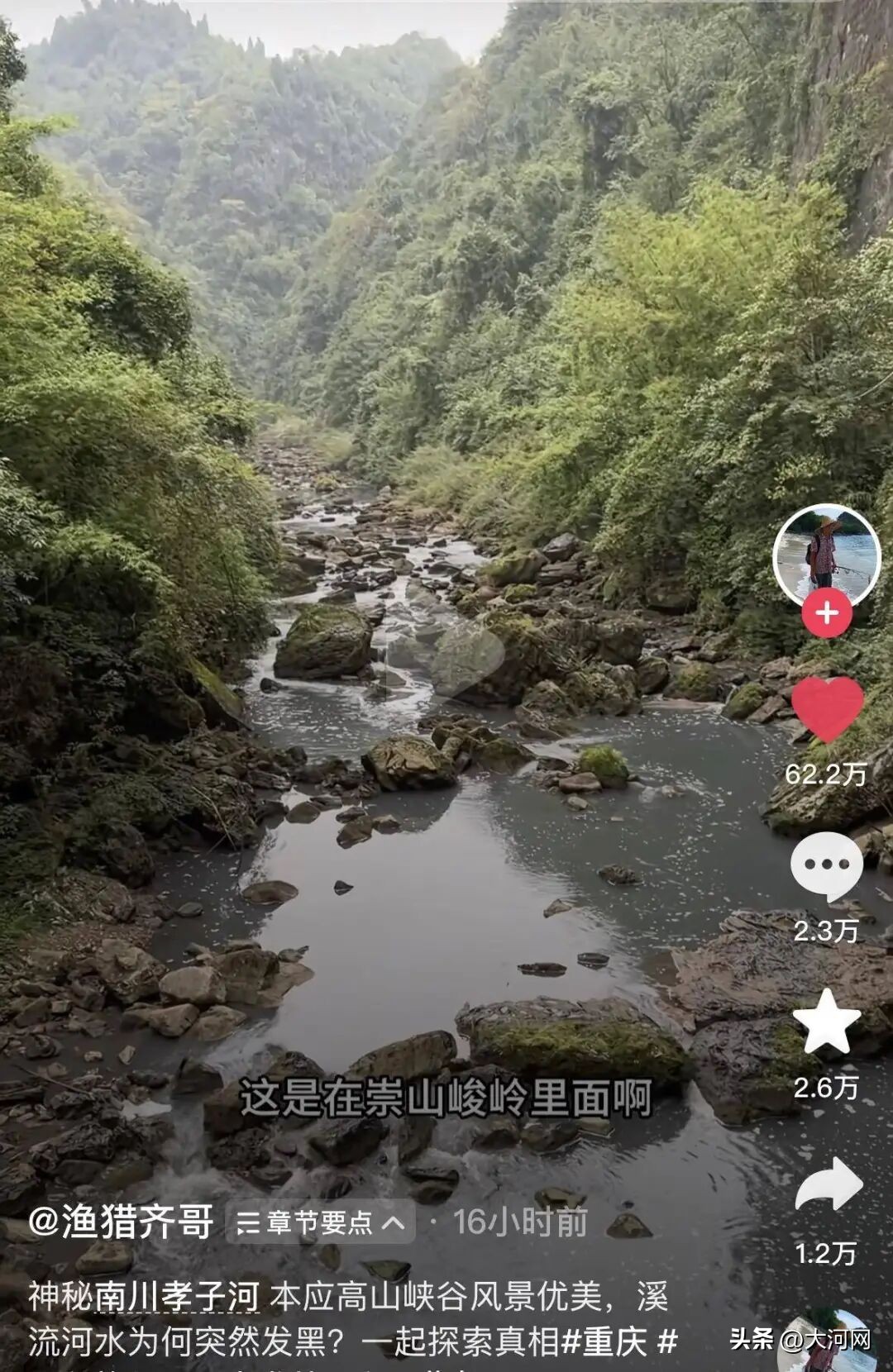 博主视频截图航拍画面显示,孝子河位于高山峡谷中,两岸青山连绵,但河水水面浮有泡沫,水体颜色乌黑。9日的视频引发关注,截至11月10日9时,点赞超过62万,诸多网友关注调查进展。