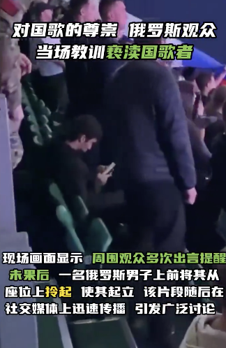 俄罗斯观众当场教训亵渎国歌者。莫斯科时间11月9日,在莫斯科举行的一场综合格斗赛事中,一名外国观众在俄罗斯国歌奏响时拒绝起立致意,反而低头玩手机。现场画面显示,周围观众多次出言提醒未果后,一名俄罗斯男子上前将其从座位上拎起,使其起立。该片段随后在社交媒体上迅速传播,引发广泛讨论。不少俄罗斯网友表示,这一举动体现了俄罗斯人对国歌及国家象征的庄重态度。