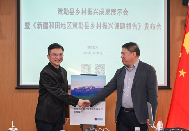为总结两年来“引智入疆”成果,2025年11月18日下午,由瞭望智库、天津市津南区共同主办的“策勒县乡村振兴成果展示会暨《新疆和田地区策勒县乡村振兴课题报告》发布会”在北京成功举行。来自政产学研媒等领域的代表齐聚一堂,共同总结援疆成果,探讨边疆地区乡村振兴的未来路径。