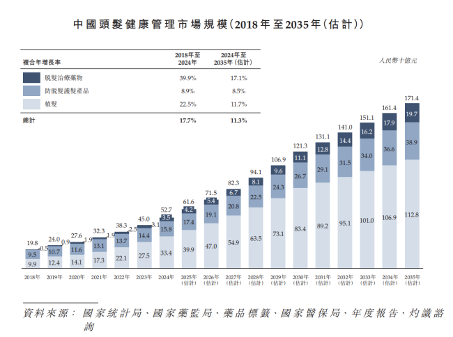 人们对美的需求,催生出了一个快速增长的头发健康管理市场,规模从2018年的198亿元增至2024年的527亿元,复合年增长率达17.7%,预计2035年进一步扩大至1714亿元。