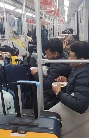 11月25日晚上,上海一名网友发布了一段视频,显示地铁车厢内有几名外籍人士坐在座位上吃馅饼,每个人手里还拿着一个行李箱。这名网友提到车厢里弥漫着咖喱味,但没有说明具体的时间和地点。其他网友根据车厢玻璃后露出的半个地铁站名推测,事件可能发生在靠近上海浦东国际机场的“凌空路”地铁站。