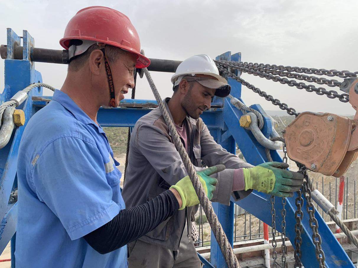 当地员工在中国师傅带领下检查钢丝绳。中国电建供图