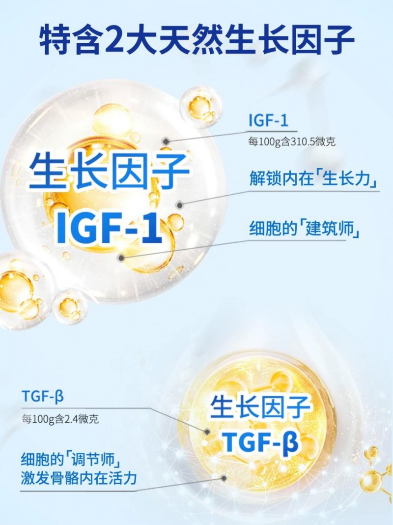 首先,骨骼的延长并非单纯依赖钙的堆积,关键在于骨骼生长板软骨细胞的持续增殖与分化。高特乐儿童成长奶粉的核心,在于科学引入了两大“生长信号因子”——类胰岛素一号生长因子(IGF-1)和乙型转化生长因子(TGF-β)。其中,IGF-1能促进软骨细胞的分裂与软骨基质的合成,为骨骼的纵向生长提供源源不断的“原材料”;TGF-β则专注于促进成骨细胞的生长,助力新生的骨质能够被稳固构建。两大因子协同作用,从源头激活儿童的生长潜力。