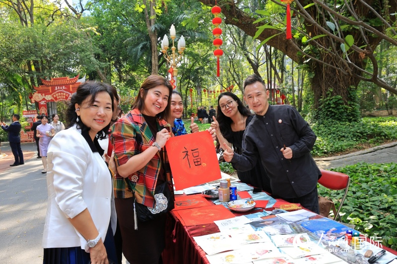 参加春节招待会的泰国友人展示现场创作的书法作品。人民网记者 白元琪摄