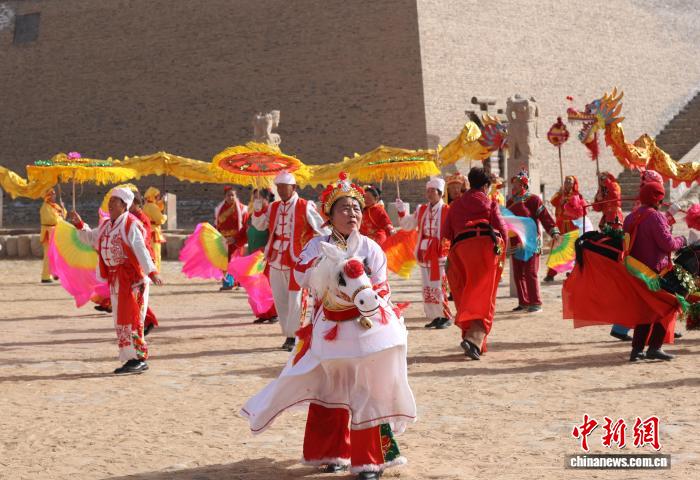 3月20日,正值农历二月初二“龙抬头”,位于宁夏银川市兴庆区月牙湖村的黄沙古渡景区内一场充满乡土气息的民俗表演热闹上演。当地村民以原汁原味的乡土表演,再现传统节日的文化魅力,表达对新一年风调雨顺、五谷丰登的美好祈愿。图为民俗表演现场。中新社记者 于晶 摄