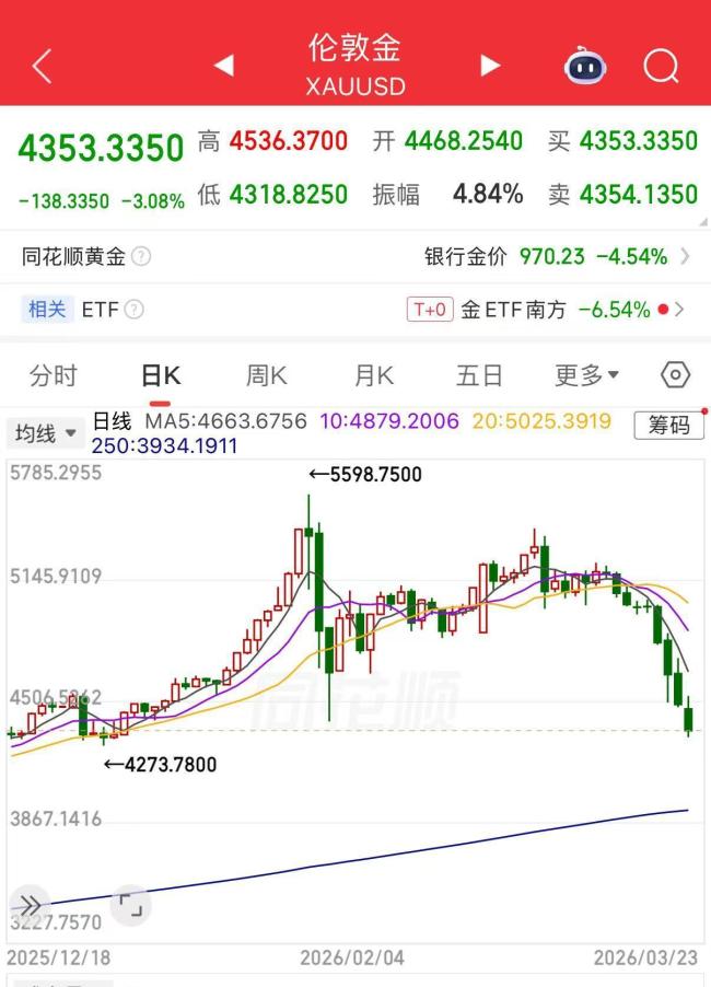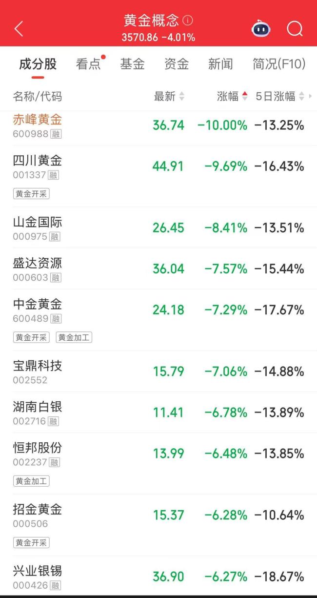 另一边,黄金价格持续下跌,国内金价进入“三位数”时代。伦敦金一度跌近4%,最低触及1807美元/盎司,创今年1月以来新低;截至午间,跌幅超3%。上海黄金交易所发布通知称,近期贵金属价格波动显著加剧,请各会员单位密切关注市场行情变化,做好风险应急预案,维护市场平稳运行,并提示投资者合理控制仓位,理性投资。当日,A股黄金板块重挫超4%,赤峰黄金跌停,四川黄金跌9%,中金黄金、盛屯矿业等跌超6%,山东黄金、紫金矿业等跌超5%。上午开盘后,国内金价迅速跌破1000元,沪金主连报970.76元/克。国际金价拖累下,国内金店零售价同步下调,老庙、周大福、六福、潮宏基等品牌足金价格均跌破400元/克。