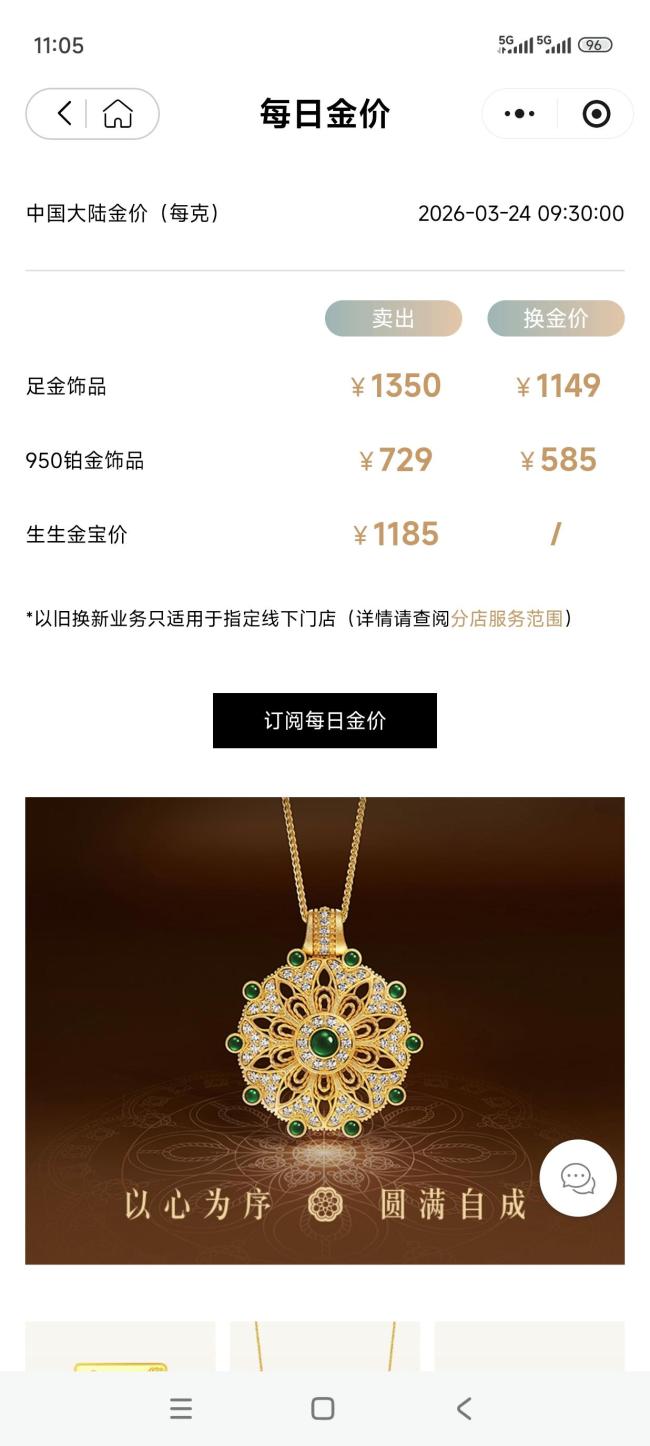 3月24日,国内品牌金饰价格继续下跌,多家知名金饰品牌报价已跌至年初水平。周大福金饰报价为1346元/克,较今年1月1日的1357元/克下跌11元;周生生金饰报价1350元/克,比1月2日1360元/克的报价低10元。