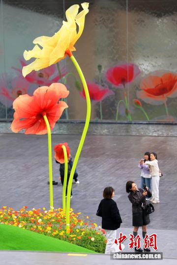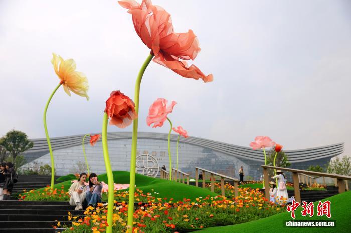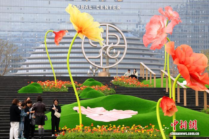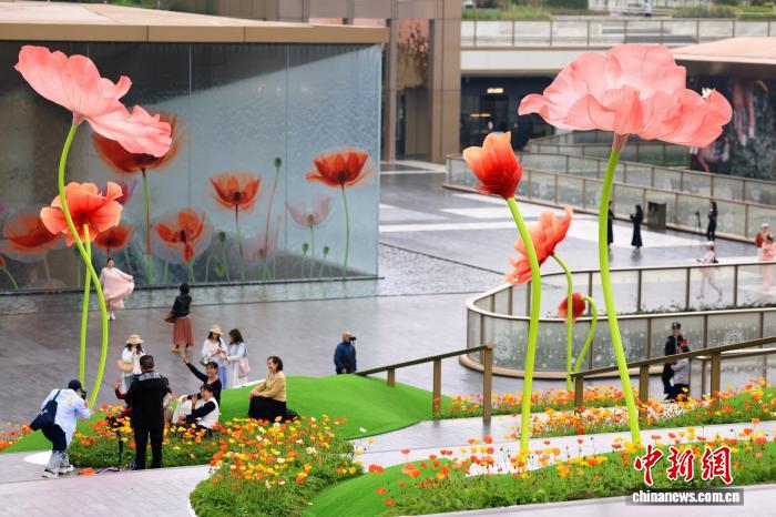 3月25日,四川成都,市民打卡巨型“虞美人”。中新社记者 张浪 摄