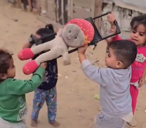 加沙孩子用担架扛洋娃娃做游戏 网友:这就是他们了解的生活
