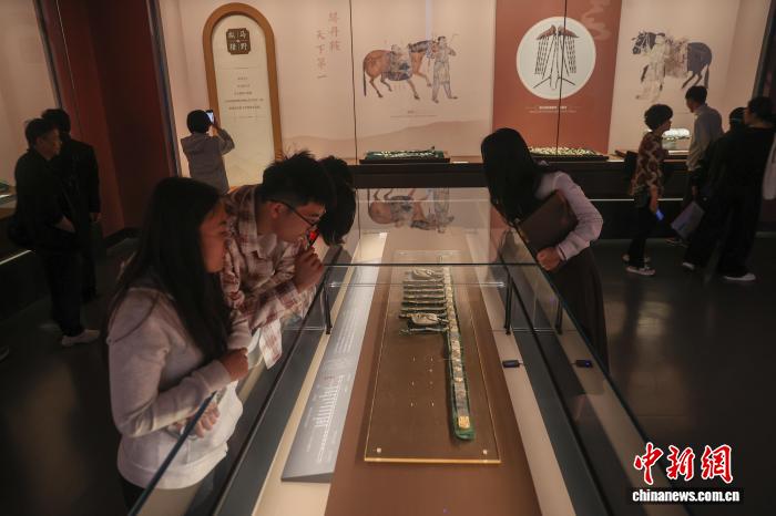 图为展出的金銙银鞓蹀躞带吸引观众观看。中新社记者 刘力鑫 摄