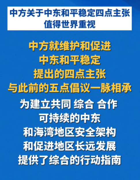 中方就维护和促进中东和平稳定提出的四点主张与此前的五点倡议一脉相承,为建立共同、综合、合作、可持续的中东和海湾地区安全架构和促进地区长远发展提供了综合的行动指南。中东国家尤其应坚持统筹发展和安全。中方愿同中东海湾国家分享中国式现代化机遇,厚植地区发展和安全土壤。