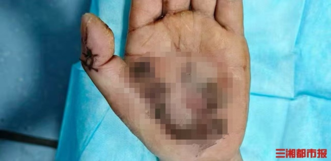 何师傅回忆,当时他洗手后脚踩积水地面,被电流击中后,手心、双脚脚趾严重灼伤碳化,创面血肉模糊。当地医院一度建议截肢保命,但他连夜转入湖南省人民医院急诊一部寻求保肢生机。