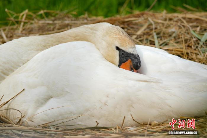4月16日,河南郑州,随着气温回升,当地疣鼻天鹅进入孵化期。图为郑州北龙湖湿地公园,疣鼻天鹅在巢中孵蛋。中新社记者 范晓恒 摄