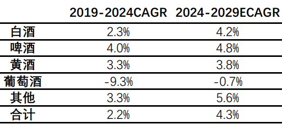 于是,在2019年-2024年这个五年周期中,啤酒超越白酒、黄酒、红酒等,成为酒类市场中增长最高的板块。下一个五年周期,啤酒同样是增长趋势最明确的板块之一。