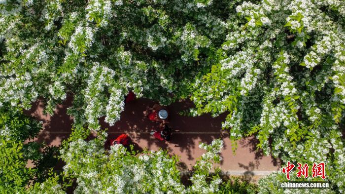 图为高铁列车穿行于盛开的流苏花间。中新社记者 范晓恒 摄