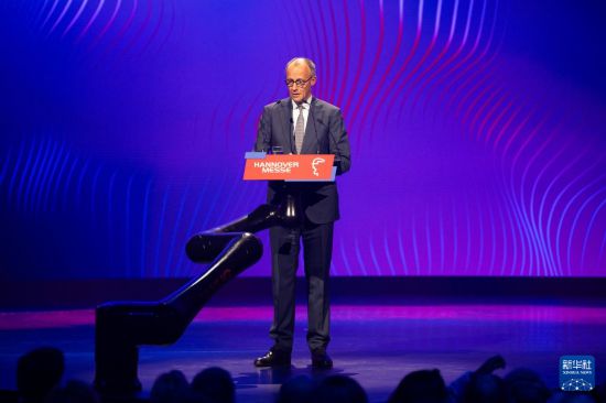 4月19日,德国总理默茨在汉诺威工业博览会开幕式上致辞。新华社记者 张豪夫 摄