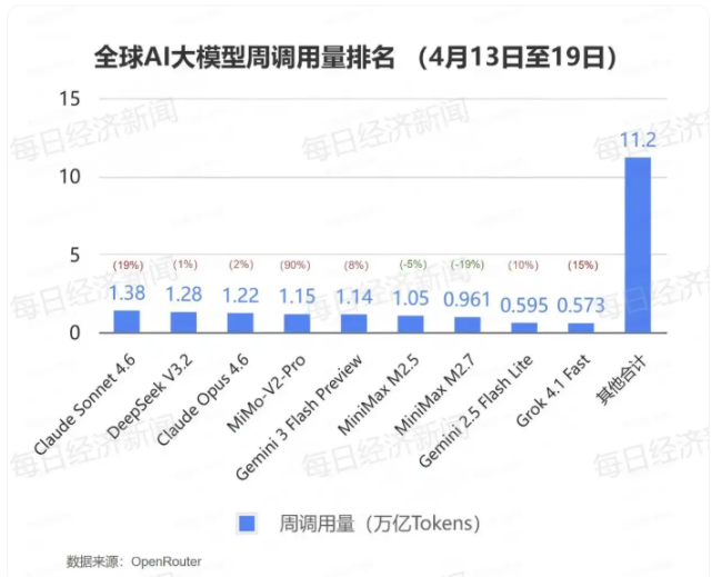 《每日经济新闻》根据OpenRouter最新数据测算,上周(4月13日至19日)全球AI大模型总调用量为20.6万亿Token,连续两周下滑。