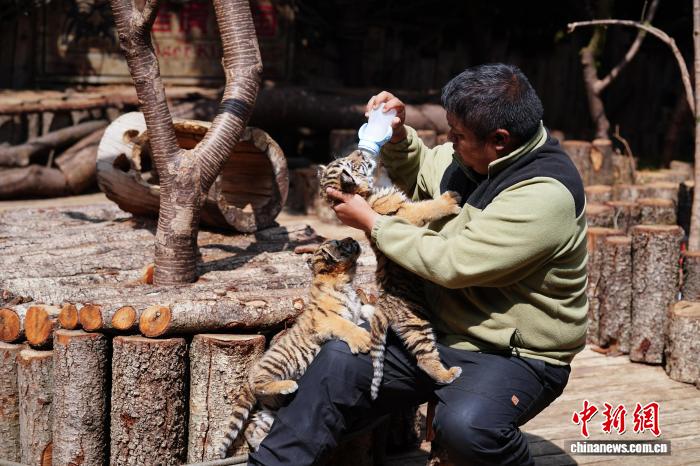 图为饲养员给小老虎喂奶。中新社记者 刘冉阳 摄