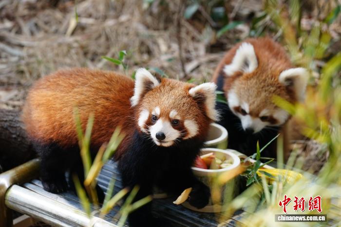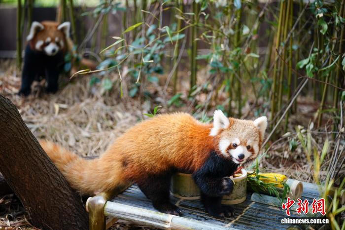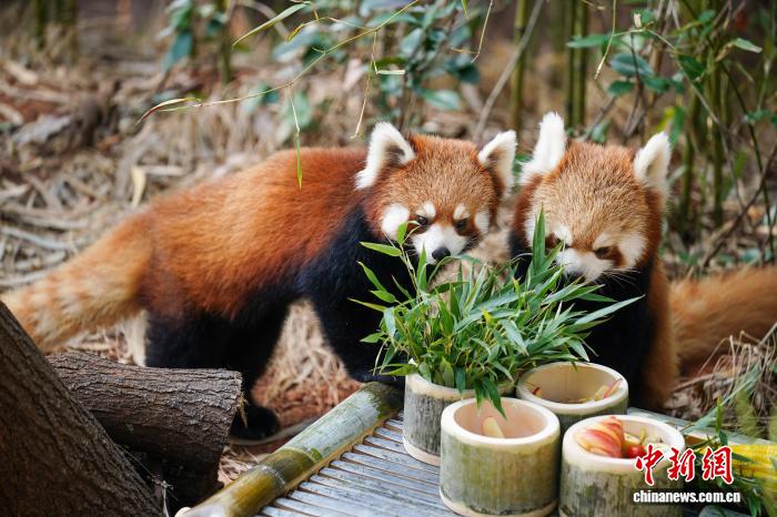 图为小熊猫享用饲养员准备的食物。中新社记者 刘冉阳 摄