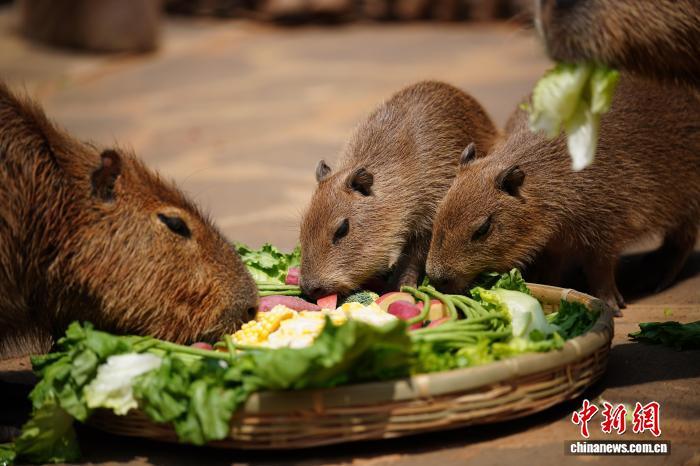 图为小水豚一家享用美食。中新社记者 刘冉阳 摄