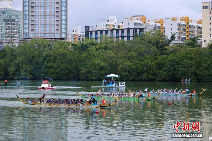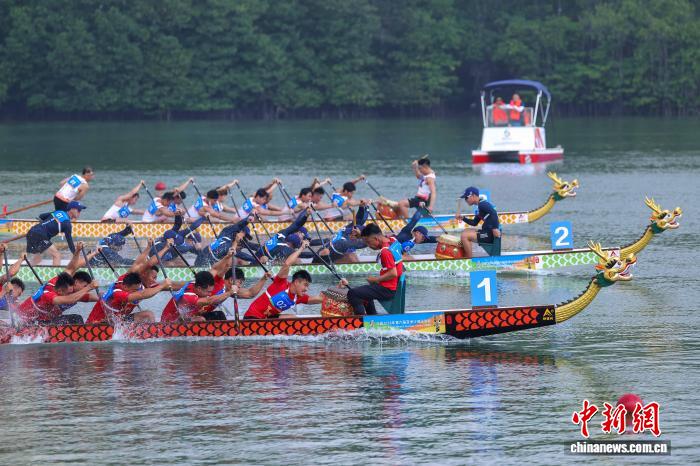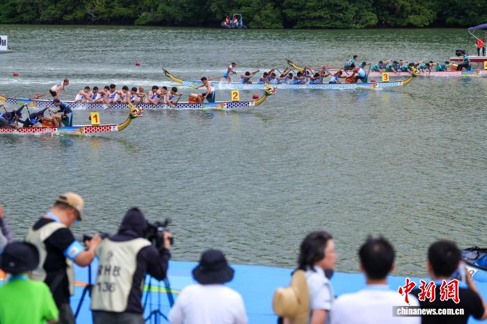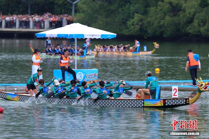图为参加男子组12人龙舟100米直道赛的队伍在预赛中。中新社记者 骆云飞 摄