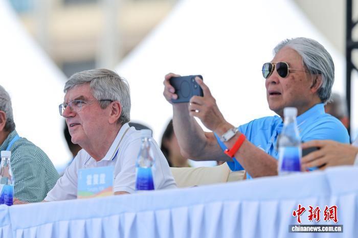 图为巴赫、霍震霆观看龙舟比赛。中新社记者 骆云飞 摄