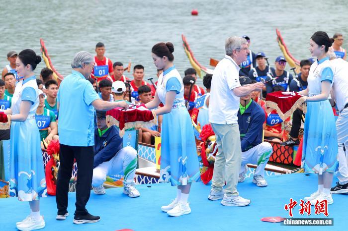 图为巴赫、霍震霆出席龙舟点睛仪式。中新社记者 骆云飞 摄