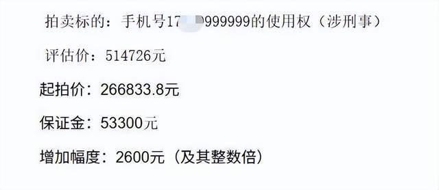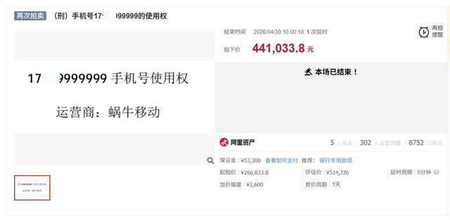 尾号9999999手机号仅2人竞拍 44万成交!4月30日,尾号“9999999”的手机号在阿里司法拍卖平台上经过四次竞拍,最终以44万余元成交。该手机号的起拍价为26.6833万元,曾以51万余元的底价挂网进行拍卖,但在24小时的拍卖周期内因无人出价导致流拍。