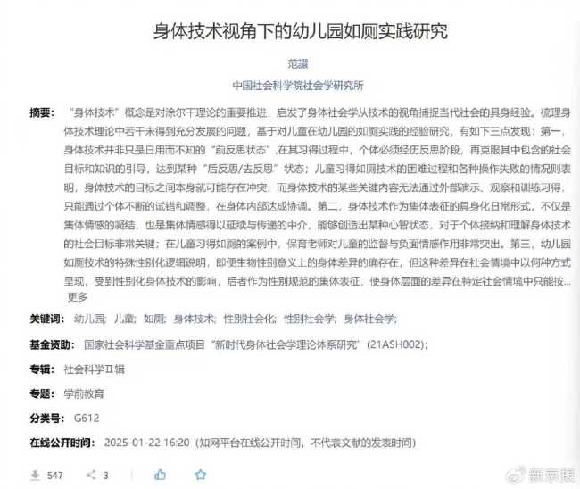 近日,福建师范大学学报(哲学社会科学版)一篇题为《身体技术视角下的幼儿园如厕实践研究》在网络上引起争议。论文中详细描述了男女童如厕时的具体姿势与过程,引发公众对该研究是否尊重儿童隐私、是否履行知情同意程序的质疑。上海社科院社会学研究所二级研...