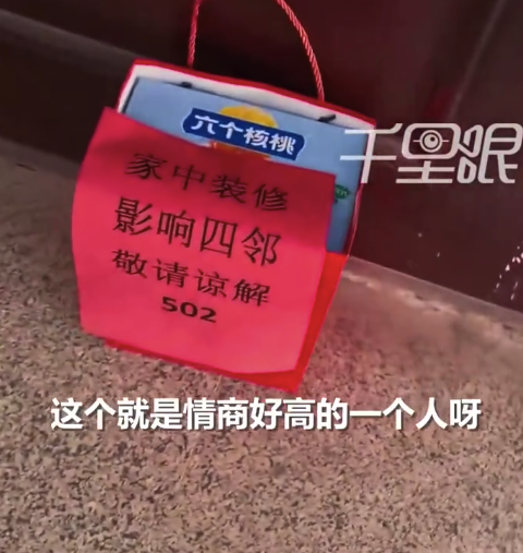 4月7日,河北邢台。一业主家装修,给全楼共5层9户邻居挨家送饮料,并贴有请谅解的字条。邻居梁女士称,感觉这家业主情商很高很暖心,避免了因装修噪音引发的不愉快。...
