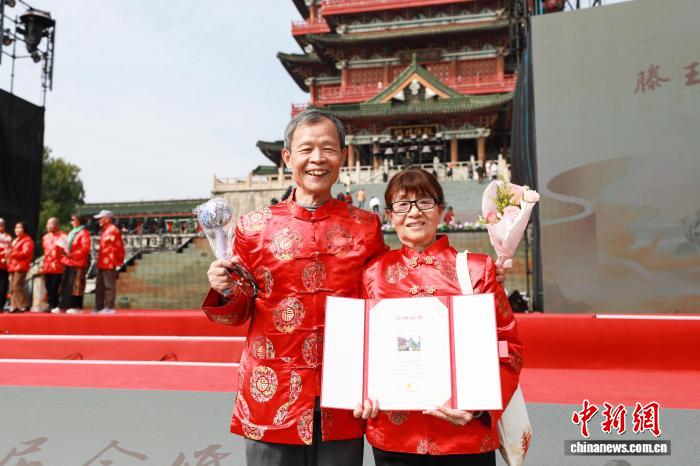 10月29日,正值重阳节,江西南昌滕王阁旅游区举办第八届金婚盛典活动,50对金婚夫妇齐聚滕王阁下,共度重阳佳节并庆祝金婚仪式。图为身着红色喜服的金婚夫妇正在滕王阁前合影留念。中新社记者 刘思伟 摄