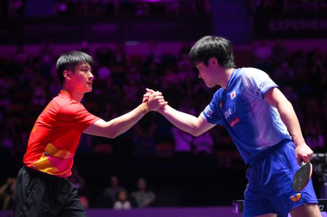 在澳门举行的2025年世界乒乓球职业大联盟(WTT)澳门冠军赛男子单打首轮比赛中,中国选手薛飞以3比0战胜日本选手张本智和,成功晋级16强。赛后,两位选手握手致意。比赛过程中,薛飞展现了出色的状态,多次庆祝得分,并在发球和回球环节表现出色