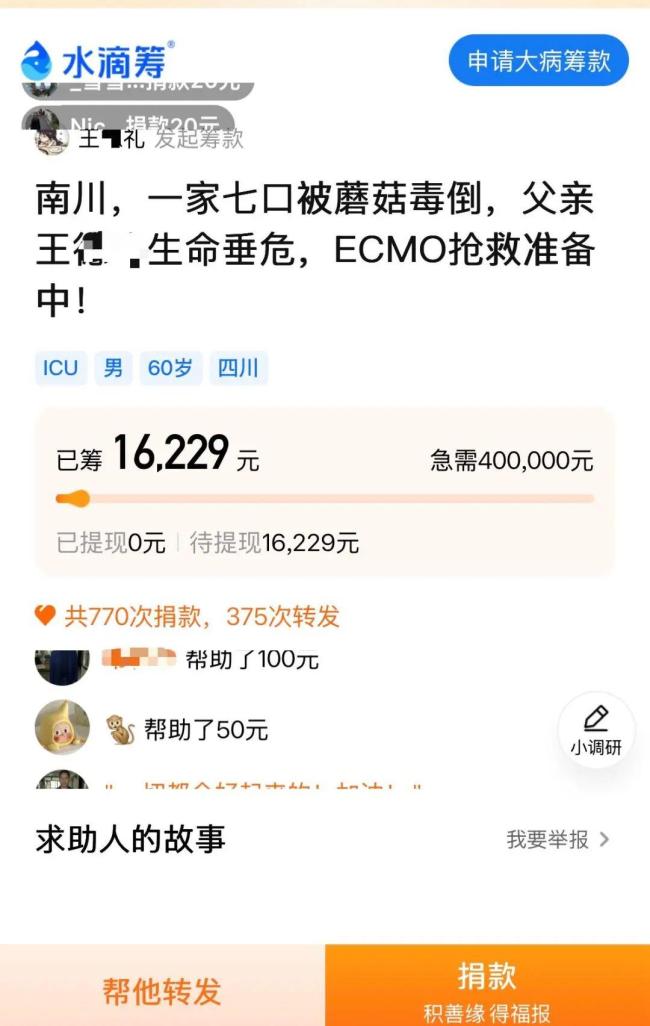 9月18日,野生菌类科普博主“鸡枞猎人”发布视频称,重庆市南川区有7人因食用蘑菇中毒送医,其中一名60岁老人住进了ICU,尚未脱离危险。在水滴筹平台上,确实有一名重庆南川的病人家属因家人吃蘑菇中毒发起了筹款